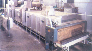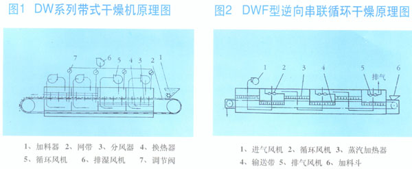 斗中的物料由加料器均勻地鋪在網帶上,網帶采用12-60目不銹鋼絲網,由傳動裝置拖動在干燥機內移動。干燥段由若干單元組成,每一單元熱風獨立循環,其
