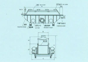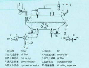 物料自進料口進入機內,在振動力作用下, 物料沿水平方向拋擲向前連續運動,熱風向上穿過流化床和濕物料換熱,濕空氣經旋風分離器除塵后由排風口排出,干燥物料由排料口排出。